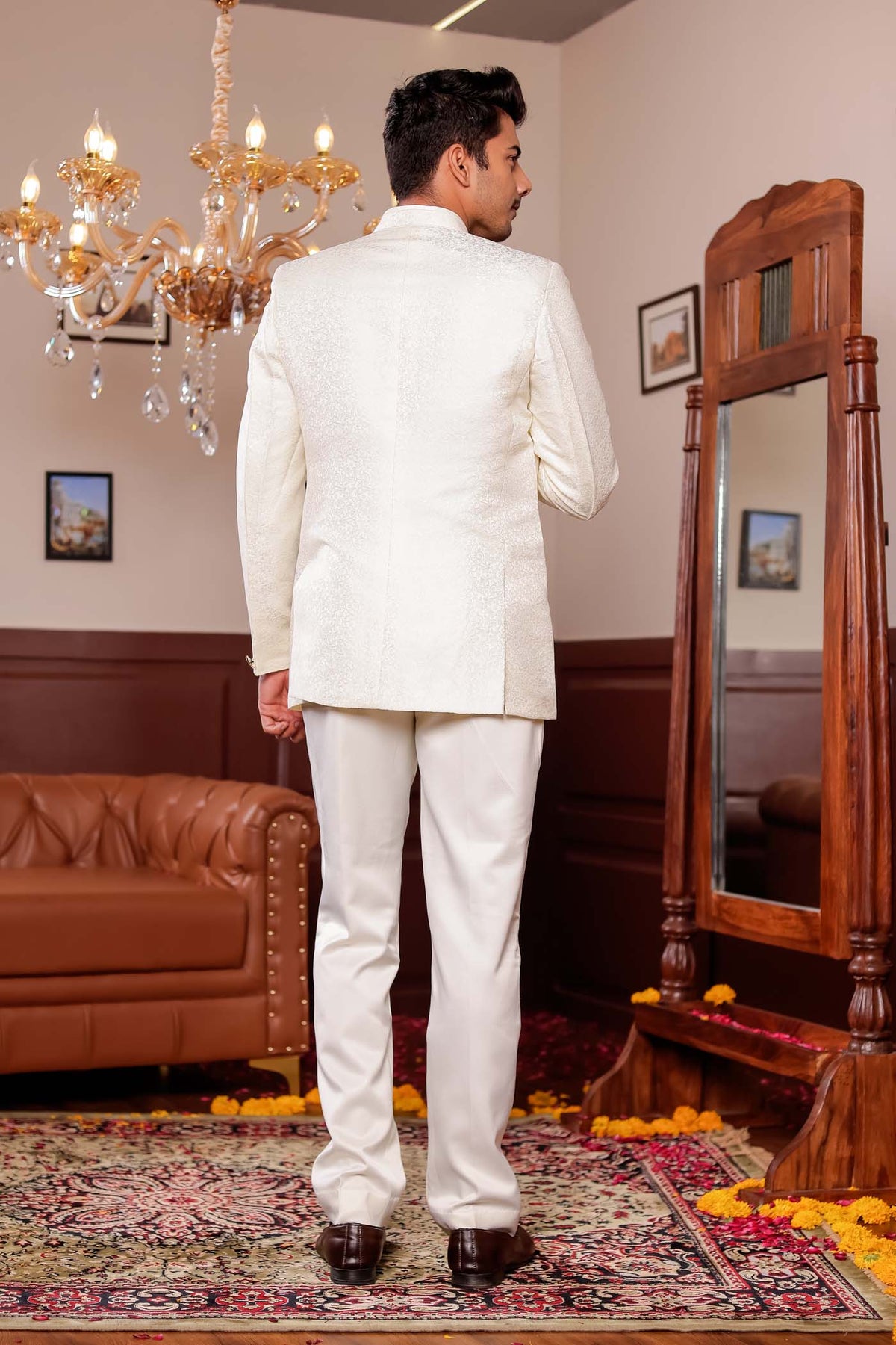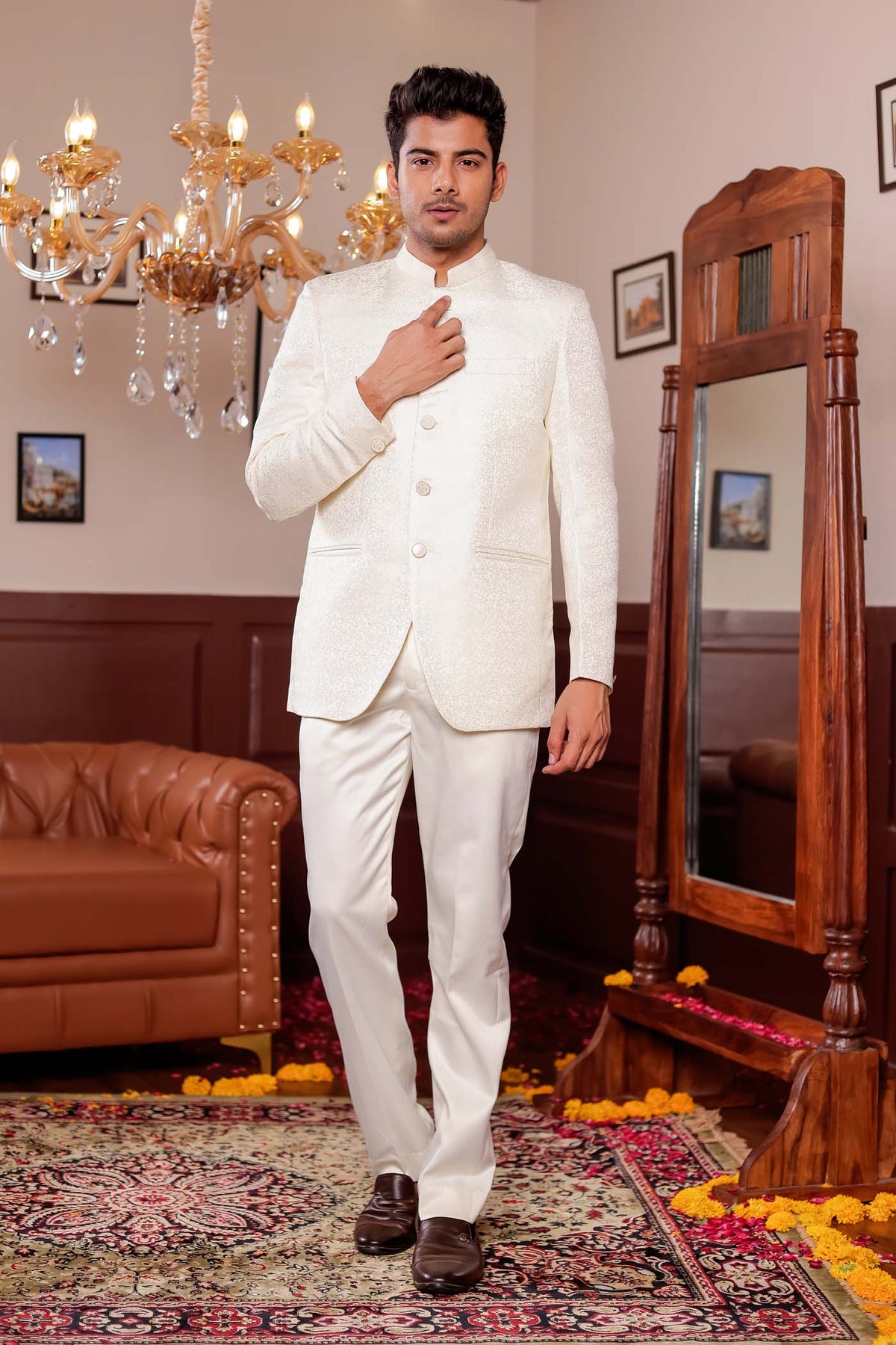 Elevate your style with our Cream Brocade Silk Jodhpuri Suit. Made with luxurious brocade silk, this suit features a smart and modern trouser, perfect for any occasion. Look sophisticated and fashionable with this elegant suit.