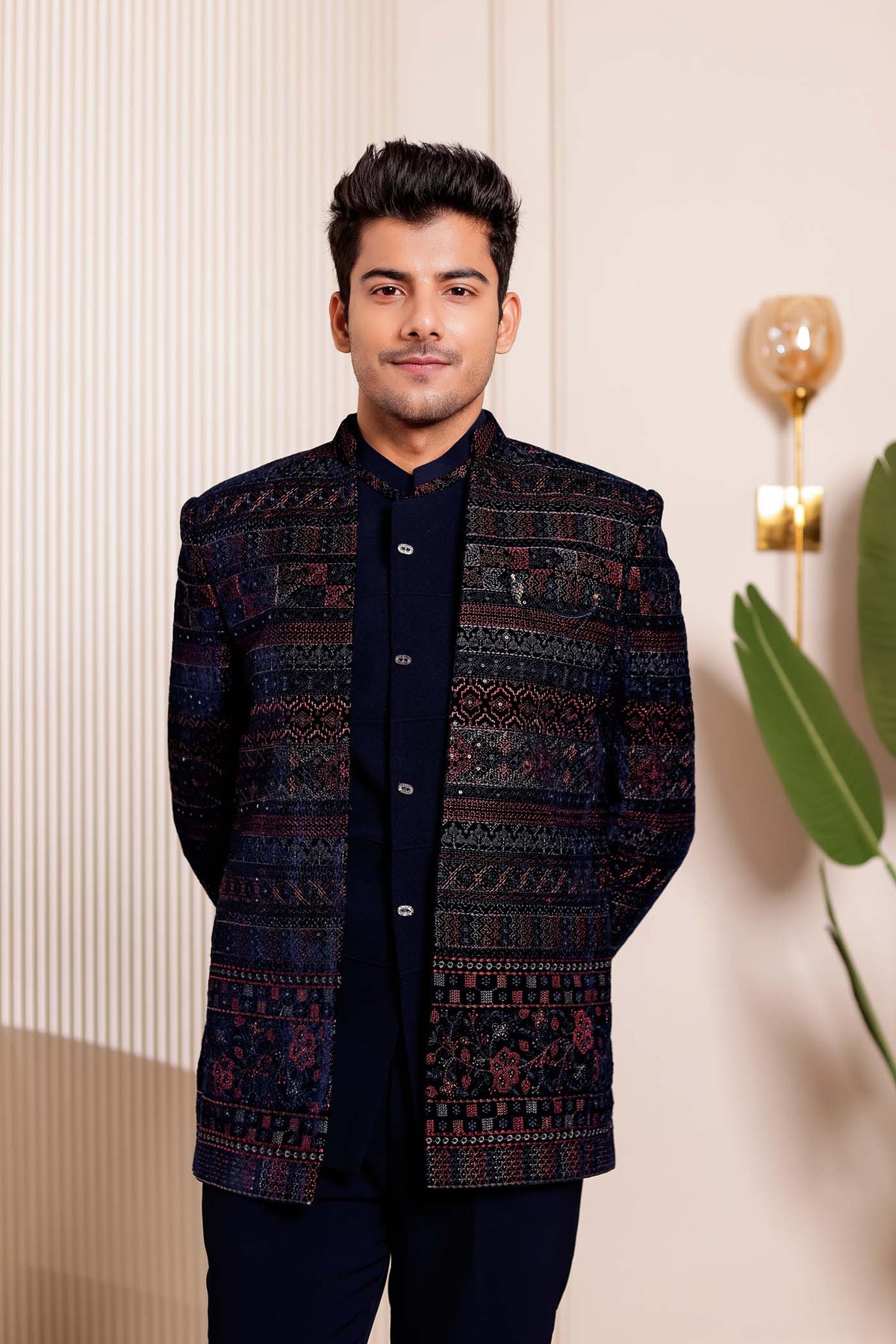 A Navy Blue Velvet 2-Piece Open Jacket Style Jodhpuri Suit, featuring exquisite hand embroidery all over with contract thread, sequin and zardozi, paired with matching navy blue trousers. This elegant suit offers a perfect blend of tradition and sophistication, ideal for weddings and formal occasions. The rich navy blue velvet fabric adds a luxurious touch, making it a timeless choice for any special event.
