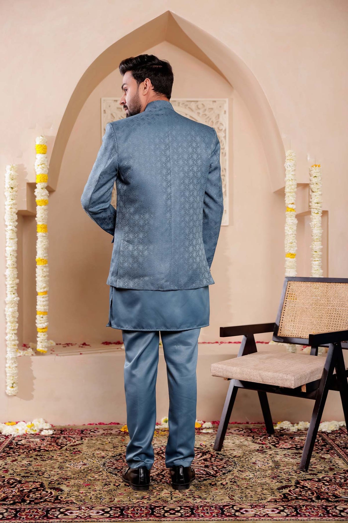 Experience the elegance of our Teal jodhpuri suit, expertly crafted with luxurious Brocade Silk fabric. Perfect for weddings and receptions, paired with short kurta and Trouser for a sophisticated and stylish look.