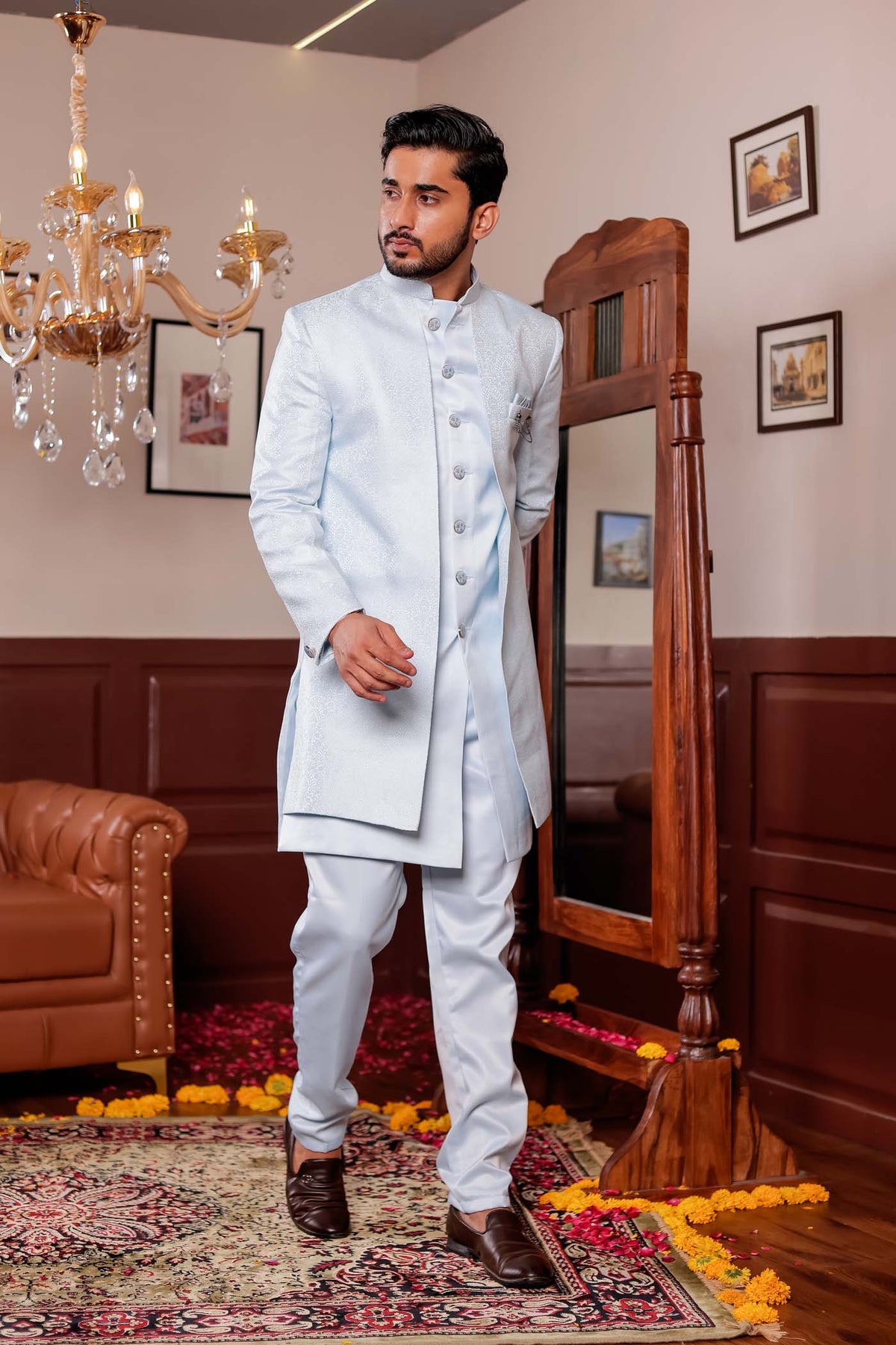 Light Blue Brocade Silk Indo-western Suit, featuring intricate self-thread embroidery in a sleek jacket style. This ensemble exudes elegance and charm, perfect for formal occasions. Elevate your attire with this fusion of traditional craftsmanship and modern design, making a statement wherever you go.