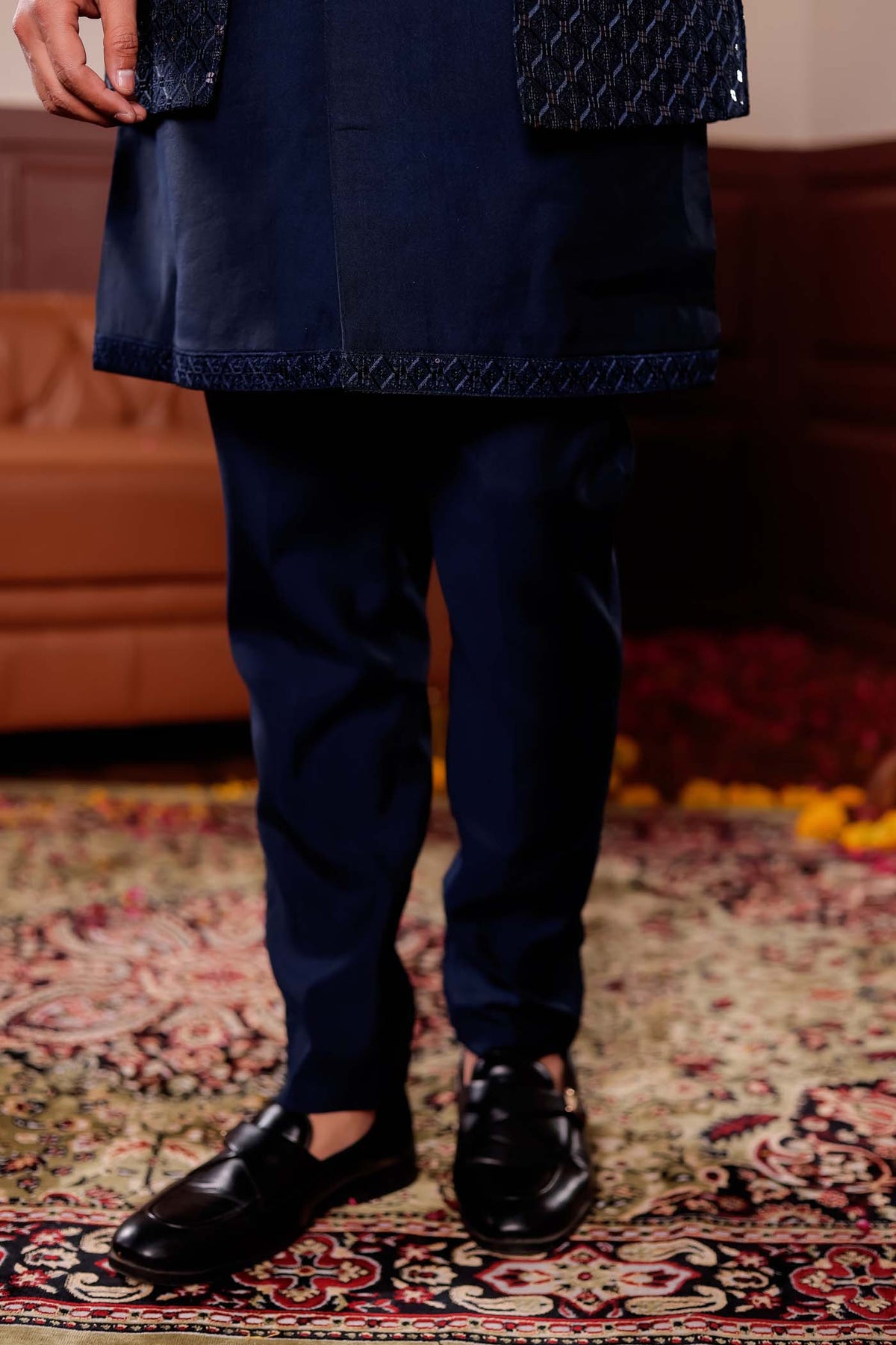 This stylish Navy Blue Indowestern suit features a modern open jacket design with short sleeves, embellished with sequin and resham embroidery. Made from premium imported suiting fabric, it offers both elegance and comfort for any occasion.