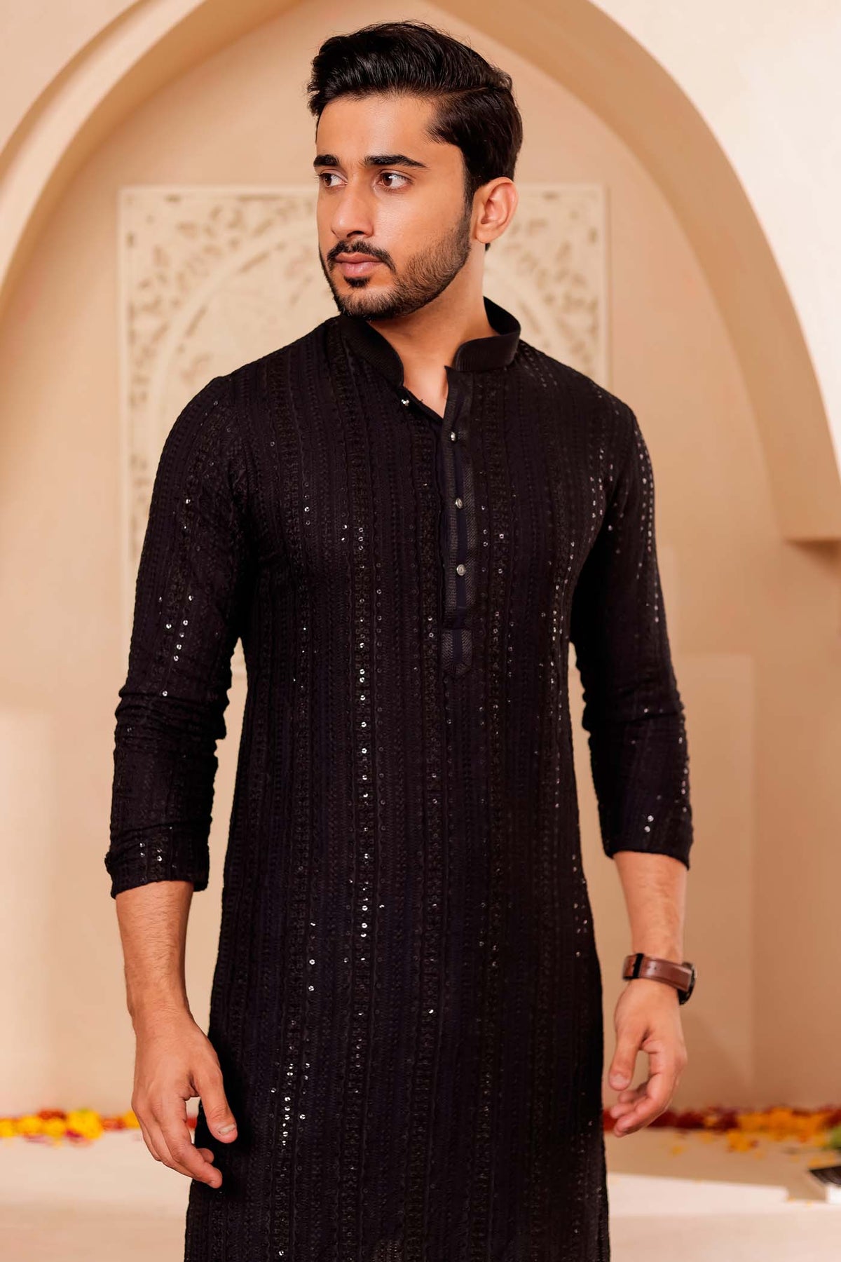 Introducing our Black Lucknowi Chikankari Kurta Set, beautifully enhanced with delicate sequin work that adds a touch of shimmer to its timeless charm. Crafted from premium Lucknowi fabric, this set is perfect for special occasions. The intricate Chikankari embroidery, paired with sequin detailing, ensures you’ll dazzle with grace and elegance.”