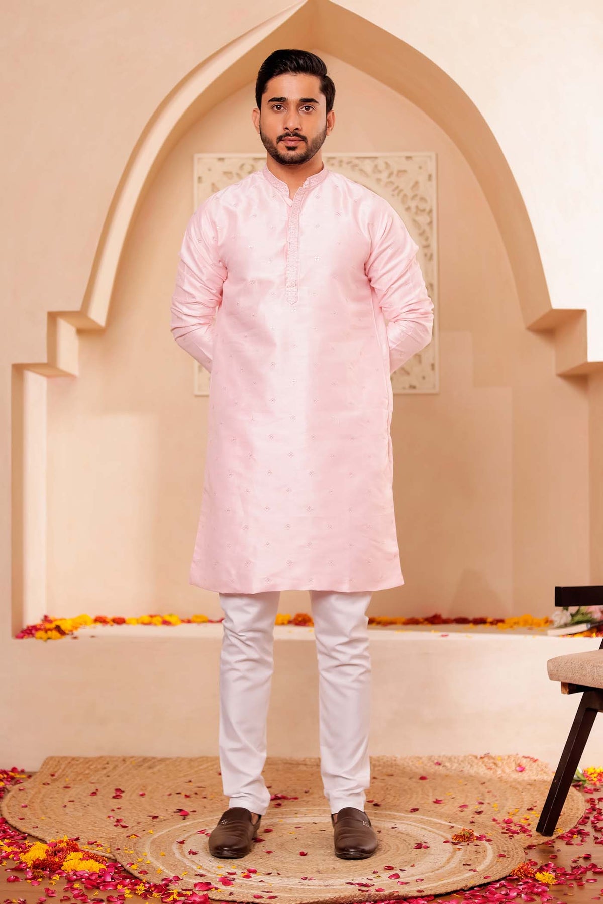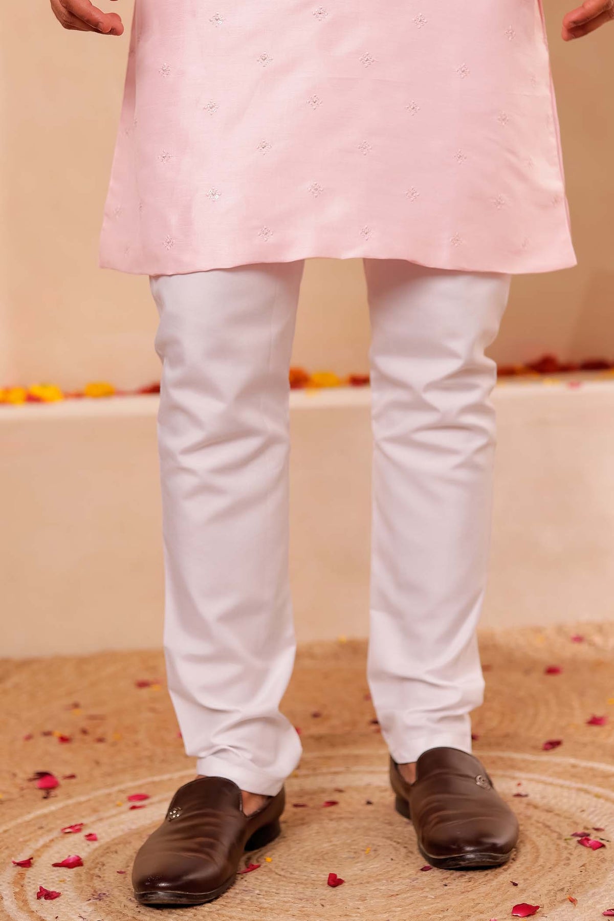 Pink Silk Kurta Suit with intricate thread embroidery on the neckline, paired with a matching white-cream churidar. This elegant and contemporary ensemble offers the perfect blend of comfort and style, making it ideal for any occasion.