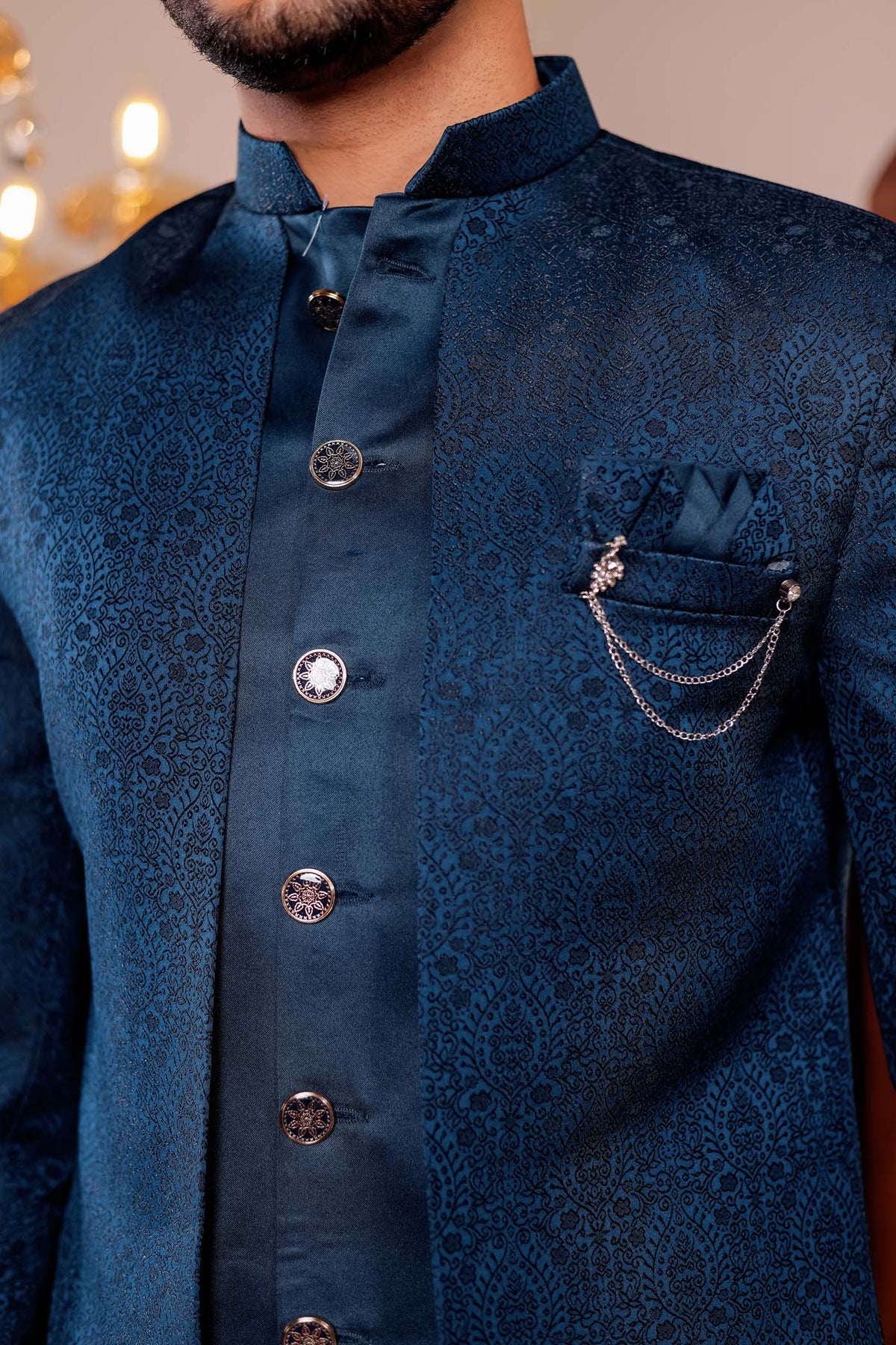 Rama Blue Brocade Silk Indo-western Suit, featuring intricate self-thread embroidery in a sleek jacket style. This ensemble exudes elegance and charm, perfect for formal occasions. Elevate your attire with this fusion of traditional craftsmanship and modern design, making a statement wherever you go.