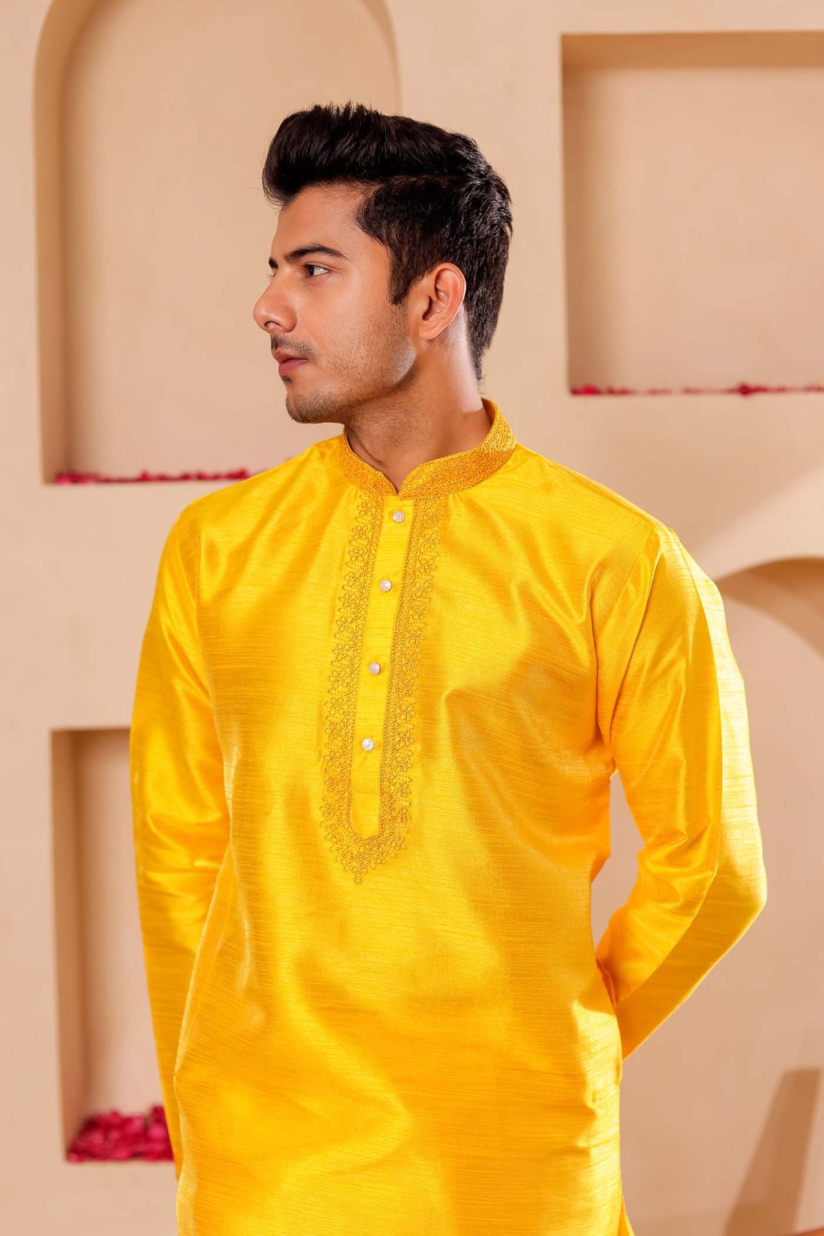 Yellow Raw Silk Kurta Suit with Intricate work on neckline.
